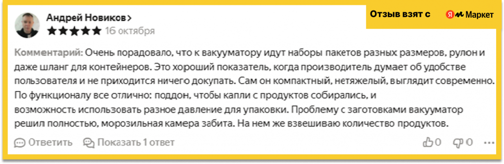 Комплектация скромная – всего 5 пакетов, без контейнеров и шлангов. Минусы очевидны: нет режима для влажных продуктов, мощность ниже средней, поэтому крупные заготовки лучше не использовать. Но для хранения сыра, овощей, орехов и небольших порций мяса этого вполне достаточно.