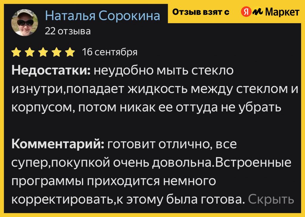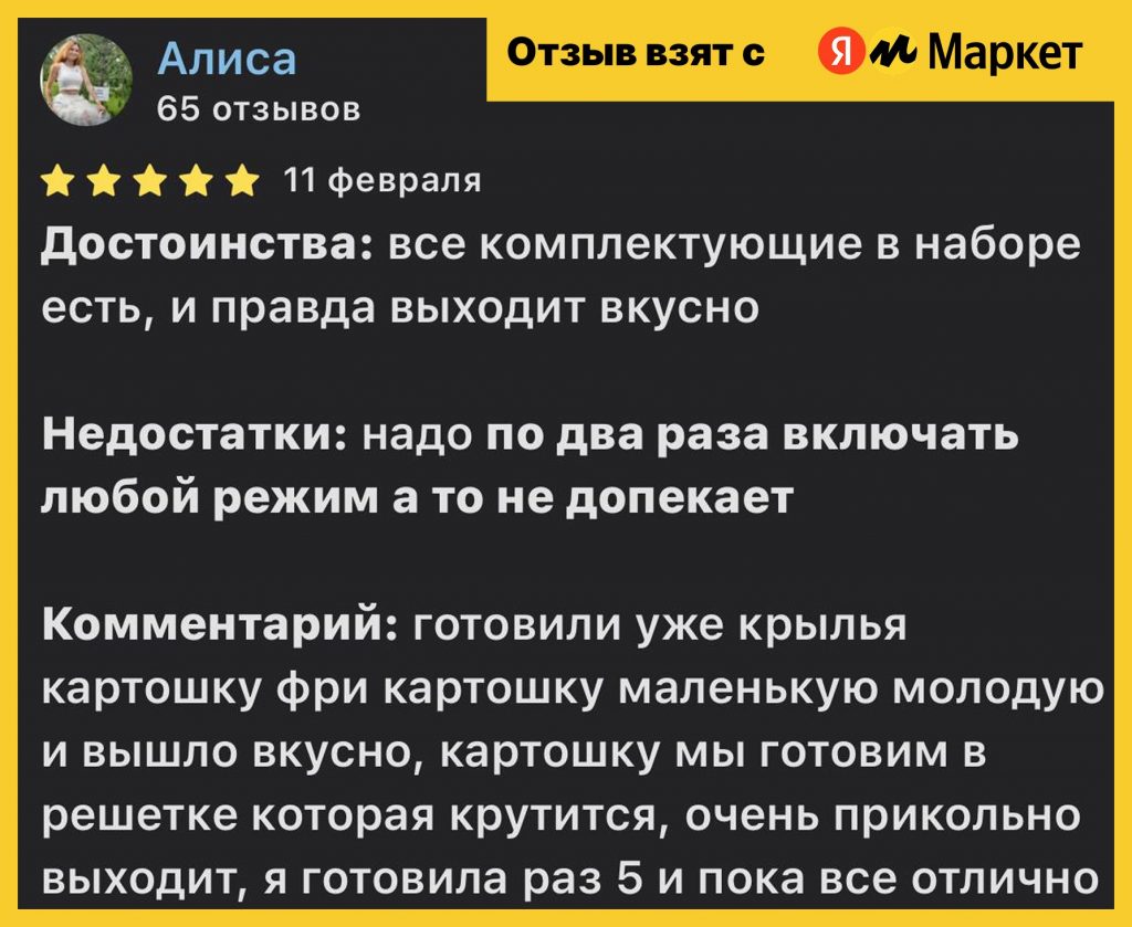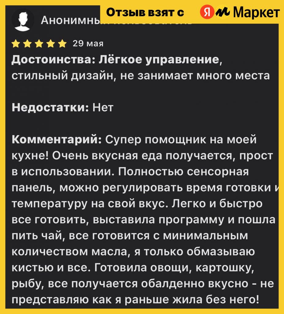 Сенсорное управление отзывчивое, дисплей крупный и читаемый. Однако пользователи отмечают, что в некоторых режимах время готовки стоит корректировать вручную — особенно для картофеля, сосисок и мяса в целом, которые могут пересушиться по заводским настройкам.